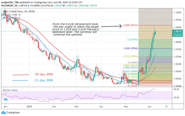 EUR/CHF is at level 82 of the Relative Strength index period 14. The market has reached the overbought region. Sellers may likely emerge to push prices down. The 50-day SMA and 21-day SMA are sloping upward indicating the bull market.