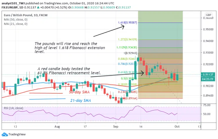 The EUR/GBP pair is now in an uptrend. A red candle body tested the 61.8% Fibonacci retracement level. The Pound will rise and reach the high of level 1.618 Fibonacci extension level. That is the high of 0.9558.