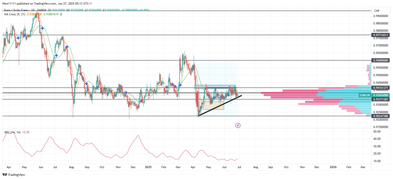 This hesitation has led to the formation of a triple top near the 0.9420 level. However, higher lows continue to emerge from the 0.9220 base, shaping the consolidation into an ascending triangle within the broader symmetrical structure. This pattern often precedes a breakout, especially when backed by sustained higher lows.