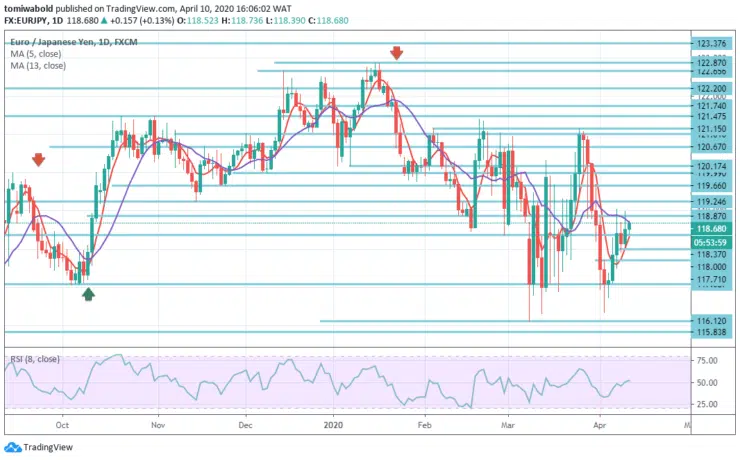 EURJPY consolidates the downside step to the 2020 trough while the pair is trading on the daily chart below its moving average of 13 signaling an active bearish trend in the currency pair.