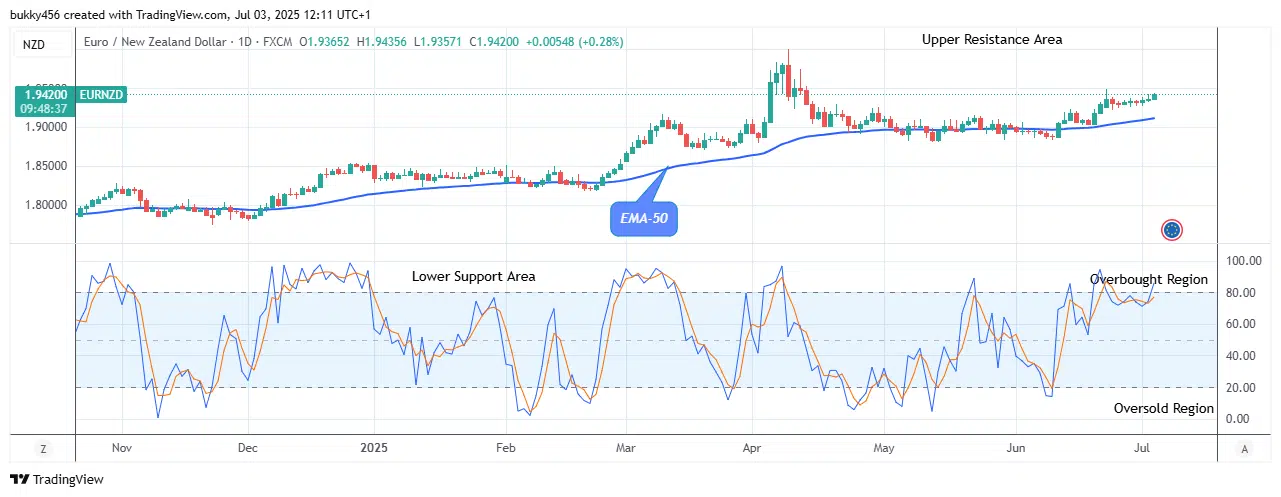 Today, the market price of EURNZD indicates a good to-buy trade at a $1.94 resistance level above the moving averages, suggesting that the bulls are in control of the market.