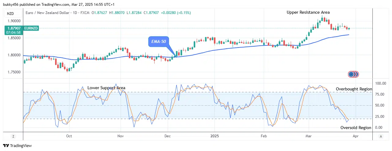 Hence, if a renewed surge in buying pressure occurs, the EURNZD price might surge to hit the previous barrier at the $1.91 supply level and extend further to a $1.95 upper resistance value, as it anticipates a further rise in its long-term view.