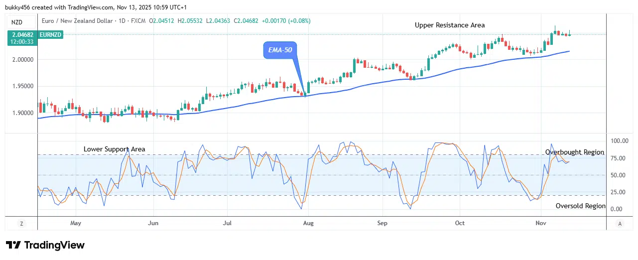 Today, the EURNZD price suggests a bullish trend at the $2.04 resistance level above the EMA-50 as the 4-hourly session opens, aiming for the upper boundary of the range.