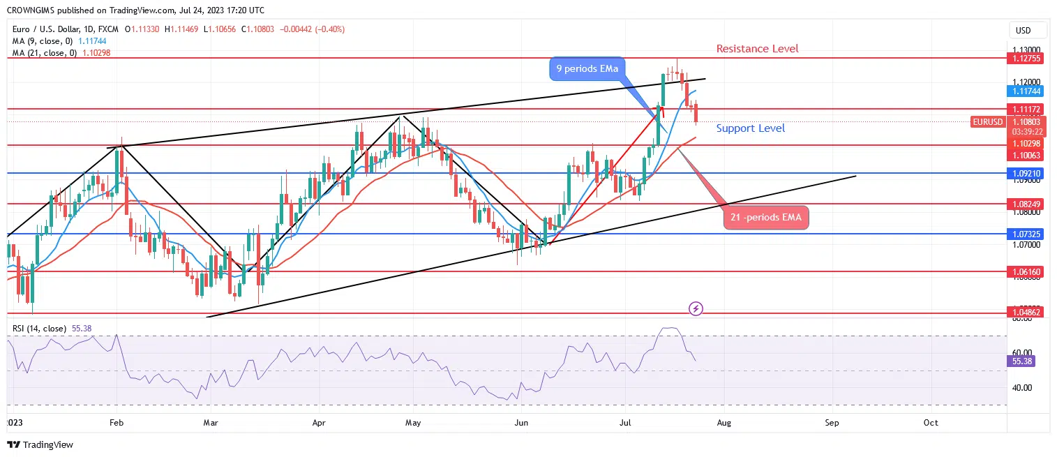 EURUSD is bearish on the medium-term outlook. The merchants’ enthusiasm has risen during the last four weeks. Bulls were in charge of the EURUSD market. The failure of the bulls to breach the $1.11 resistance level causes the price to decrease. There is a potential that the price may fall to the $1.10 level. The bears successfully hold the $1.11 resistance level, and the price is presently falling.
