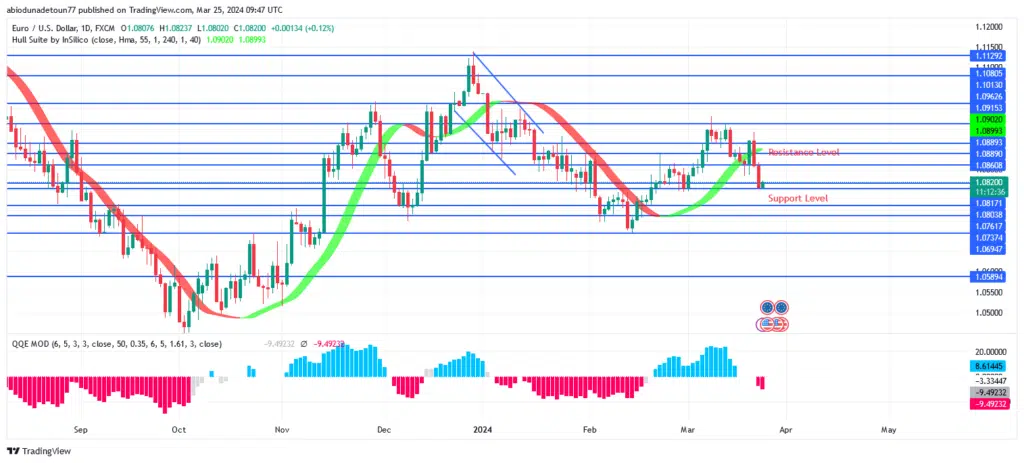 The market is decreasing, according to the Hull Suite, which is positioned above the currency pair. If buyers can break above the $1.08 resistance level, they might be able to soon approach the $1.09 and $1.10 barrier levels. If sellers manage to hold the price below the $1.07 barrier, prices can fall to the support levels of $1.06 and $1.05 levels.