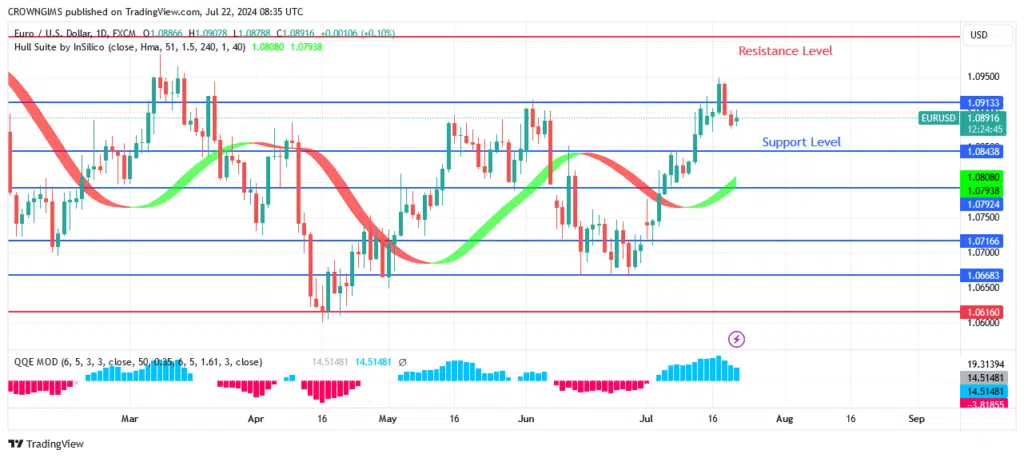 In the medium term, a turnaround in the EURUSD is anticipated. Over the past three weeks, there has been bullish pressure on the currency pair. A double bottom chart pattern appears at $1.07. The price started to rise as it got closer to $1.08 and eventually over that mark. Since crossing above the Hull Suite signal, the price has generated enormous bullish candles. The value rises from $1.07 to $1.09. As of today, the price is rising.