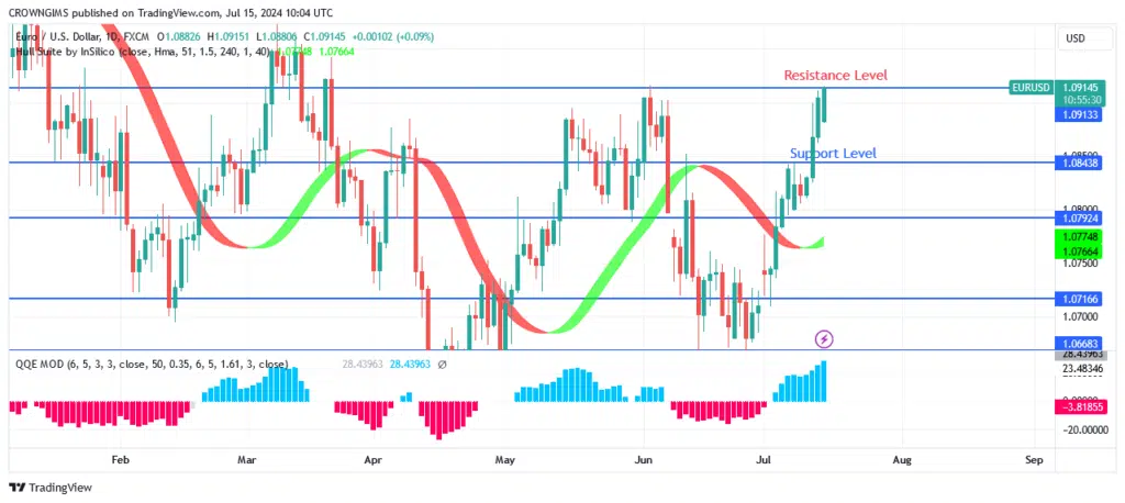 A turnaround in the EURUSD is expected in the medium run. The currency pair has experienced negative pressure during the last three weeks. At $1.08, a double top chart pattern emerges. As the price approached $1.07 and eventually crossed that threshold, it began to incline. The price has produced massive bullish candles ever since it crossed over the Hull Suite signal. The $1.07 price increases to $1.08 in value. Right now, the cost is increasing.
