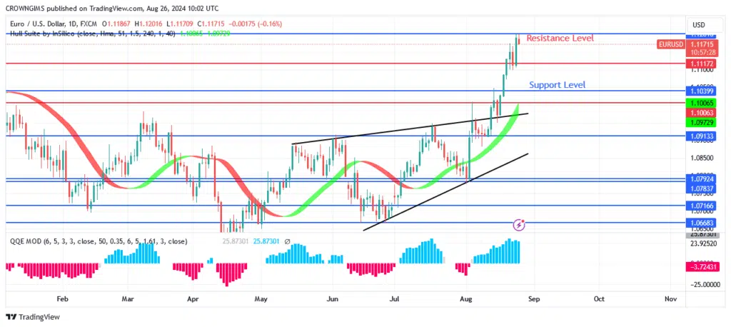 A turnaround in the EURUSD is expected in the medium run. The currency pair has been under upward pressure for the last three weeks. At $1.08, a double bottom chart pattern emerges. As the price approached $1.09 and then surpassed it, it began to rise. The price has produced massive bullish candles ever since it crossed over the Hull Suite signal. The amount is increasing to $1.12 from $1.07. The unit cost is getting close to $1.12.