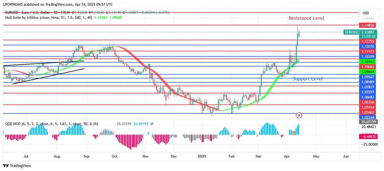 The bullish trend began near the $1.02 line, according to the daily chart’s robust double bottom pattern formation. The bulls fought the downward trend of the price. The price began to rise as bulls gained strength. The threshold was crossed during the $1.08–$1.07 range. Before getting stronger, it tested the most recent $1.08 support level. To ensure the sale, the purchasers prevent offers from exceeding their offer limit. With more purchasers entering the market, the price is rising and getting closer to $1.14. It is now making a lot of effort to get past the previously established barrier level.