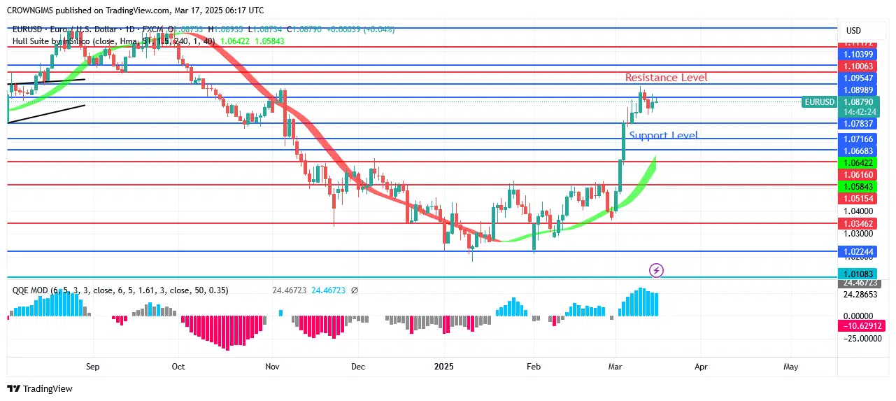 If buyers can break through the resistance level at $1.09, they might be able to push the price up to the $1.10 and $1.11 barrier levels. Prices may go below the $1.05 and $1.04 support levels if sellers are able to keep the price below the $1.07 barrier.