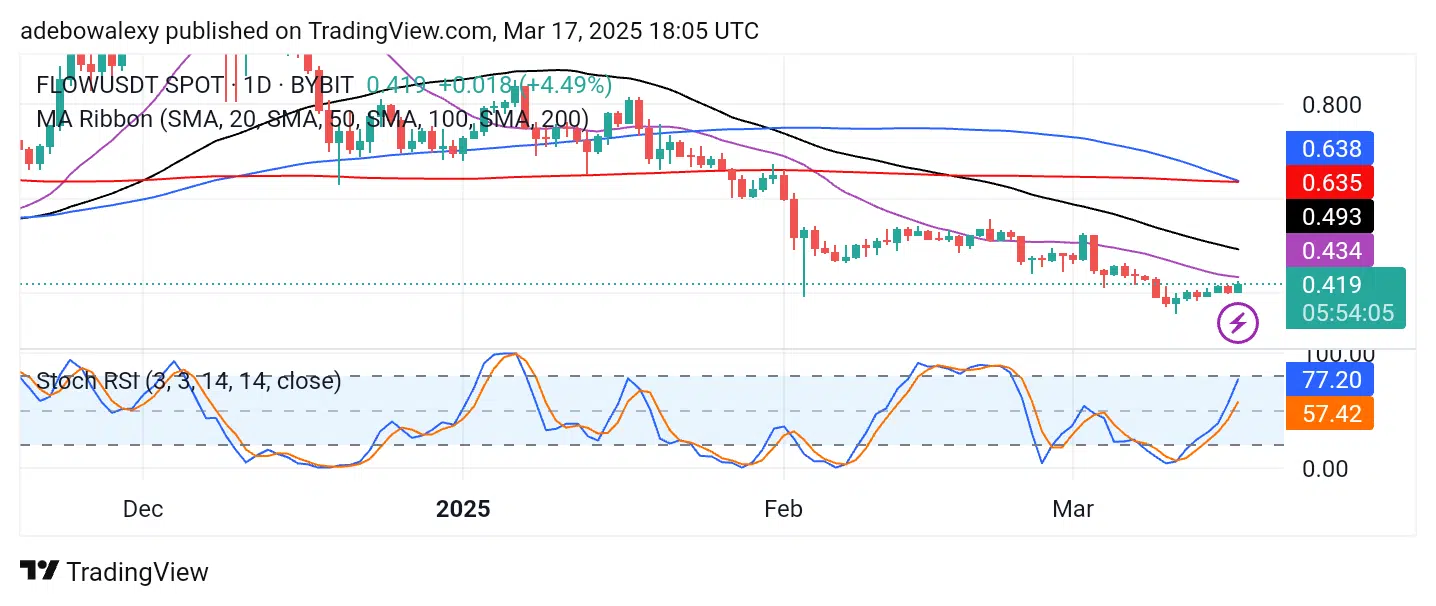On the 4-hour FLOW/USDT chart, price action has moved above the 20-day and 50-day MA lines. Additionally, recent price candles appear green, suggesting increased buying activity. Meanwhile, the Stochastic RSI lines have risen into the overbought region.