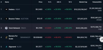 With Bitcoin breaking past successive all-time highs, other cryptocurrencies are beginning to benefit from a surge in bullish momentum. This week’s list of trending cryptocurrencies shows HBAR leading the pack, followed by Bounce Token (AUCTION) and 1inch (1INCH) in second and third place, respectively. Most of these tokens have recorded significant gains over the past […]