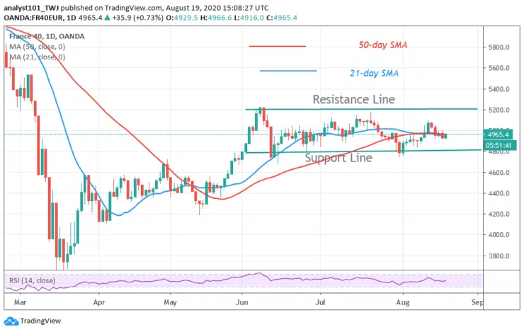 France 40 index is in a sideways move. The index is currently fluctuating between levels 4800 and 5200. FR40EUR is trading in the middle of price range. The price is not close to breaking any of the key levels. This will delay the range-bound movement to a trending market.