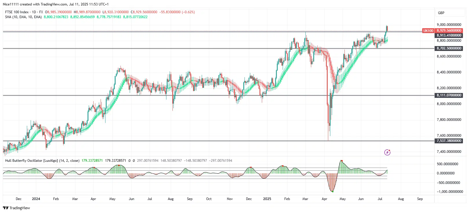 The Hull Butterfly Oscillator showed that the market was oversold at 7537.0 during the crash, signaling a key buying opportunity. This was followed by a strong bullish reversal, characterized by a consistent series of higher highs and higher lows as the price climbed toward the previous all-time high of 8913.0.