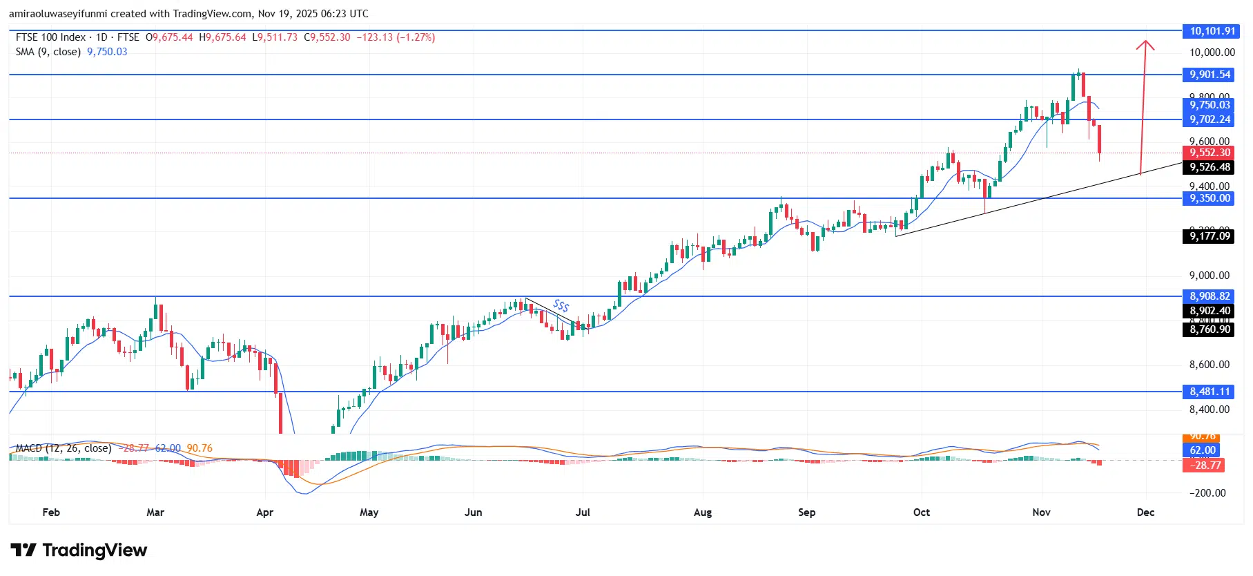 A rebound from this zone could propel price back toward interim resistance at $9,700, where buyers may attempt a breakout. If momentum continues to strengthen, the index could extend toward $9,900 and potentially retest the $10,100 region.
