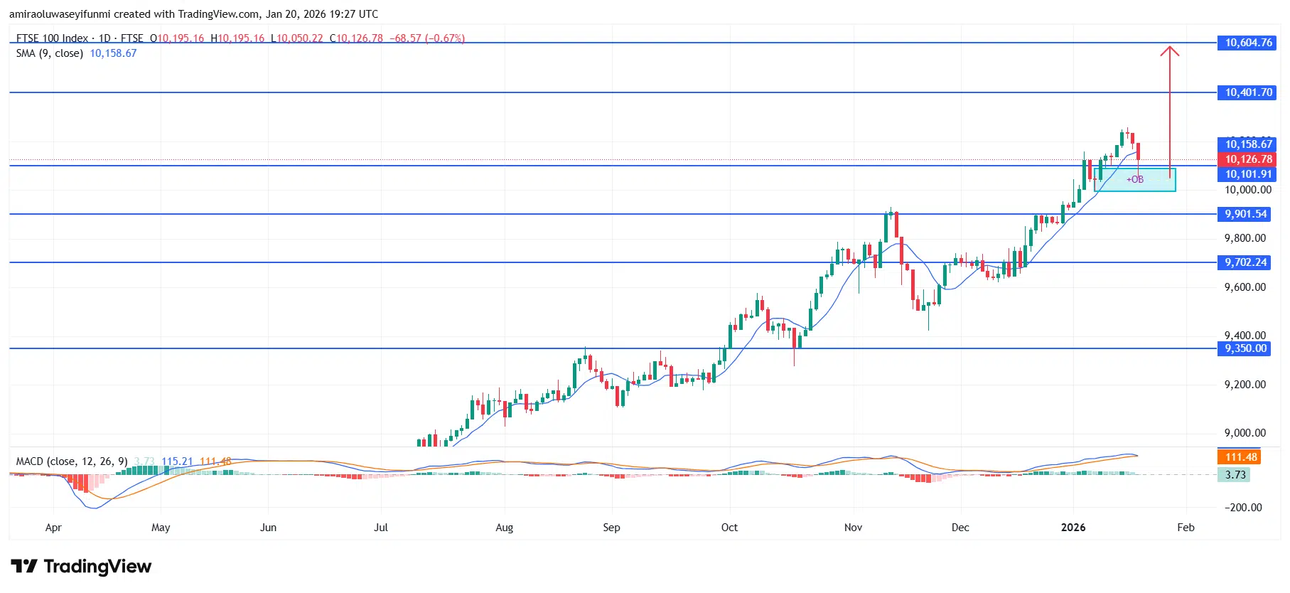 FTSE 100 index buyers stay as prices push upward in their favour. The FTSE 100 continues to trade firmly above the rising short-term moving average near $10,160, preserving positive directional alignment within a structurally supportive environment. Momentum conditions remain constructive, with the MACD maintaining a stable histogram above the zero line, reflecting sustained demand rather than late-stage excess. Buyer control throughout the recent price cycle is further reinforced by the prevailing sequence of higher highs and higher lows.