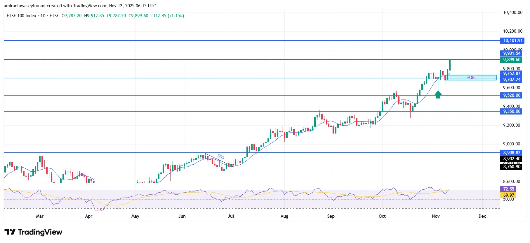 Looking ahead, the FTSE 100 appears poised to test the $9,900 resistance, with potential for an advance toward the $10,100 mark if buying momentum continues. A decisive daily close above $9,900 would confirm the continuation of the prevailing uptrend. Should the price revisit the $9,700 area, it is expected to act as a new demand zone, reinforcing the broader bullish market framework. Traders can also monitor forex signals to identify potential entry and exit opportunities as momentum builds.