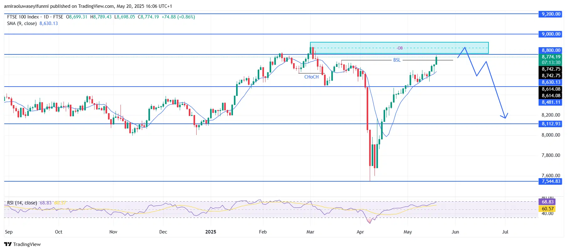 FTSE 100 signals a late-stage rally at the key supply level of $8,800. Technical indicators are beginning to highlight signs of exhaustion in the recent upward movement. The 9-period Simple Moving Average (SMA) has been steadily climbing near the $8,630 level, confirming short-term bullish sentiment. However, the 14-day Relative Strength Index (RSI) is hovering around 69, indicating overbought conditions and fading upside momentum.