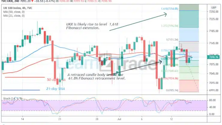 UKX index upward move has been facing rejection at level 7200. Since May 7, the resistance at level 7200 is yet to be broken. Meanwhile, on July 13 uptrend; a retraced candle body tested the 78.6% Fibonacci retracement level. The retracement indicates that UKX is likely to rise but reverse at level 1.272 Fibonacci extension or level 7198.64.