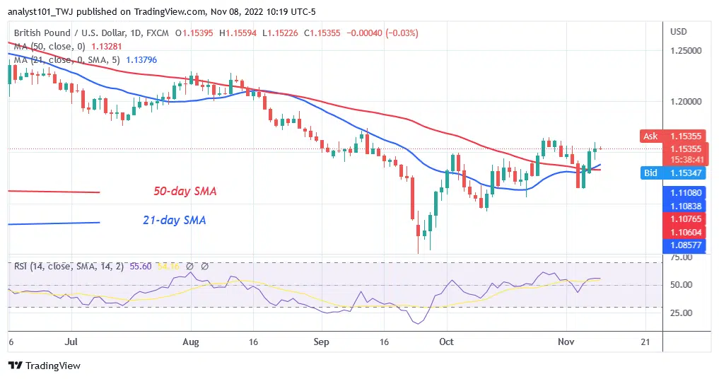 The GBP/USD pair has risen above level 1.1161 as it targets 1.1750 high. Selling pressure may become more intense when the price falls below the moving average lines. The Pound will drop to levels 1.0952 and 1.0356, which were prior lows. The bullish candlesticks of today, however, indicate that the pair is advancing higher. It suggests that near the current level, the market is oversold. When buyers start to enter the market, the pair will rise. At level 1.1600, the upward corrections are currently being rejected.