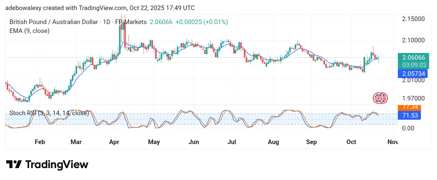 The GBPAUD market has managed to stay afloat above the 9-day Exponential Moving Average (EMA) line. The current session has experienced some notable compression, resulting in a spinning top-shaped candle. Nevertheless, price action remains positioned above the 9-day EMA curve.