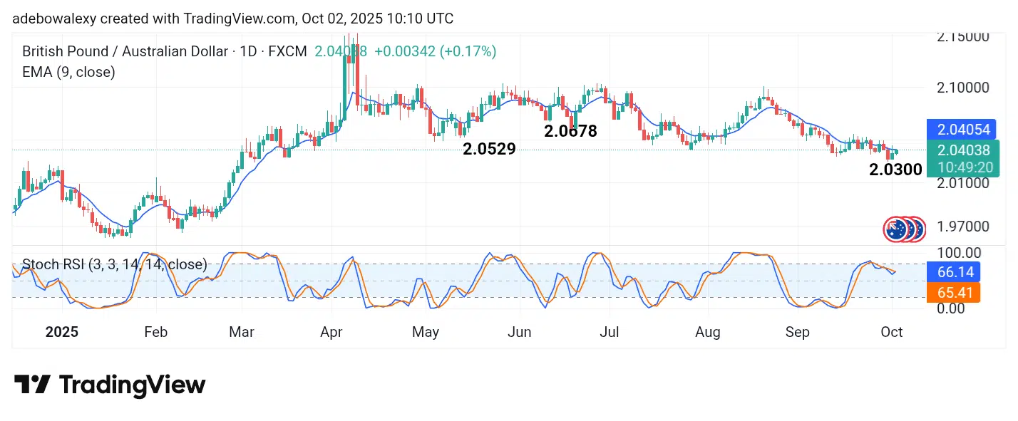 The ongoing upside retracement in the GBPAUD market has been active since the previous session. The latest price candle on the chart, representing the current session, is positioned closely along the 9-day Exponential Moving Average (EMA) line.