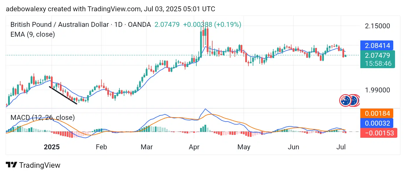 Although the GBPAUD market is attempting an upward retracement, the momentum appears to be fading. This is evident from the diminishing size of recent green price candles, all forming below the 9-day EMA curve. The current session’s candle appears to be a small, dashed-shaped formation, which further suggests the influence of downward pressure.