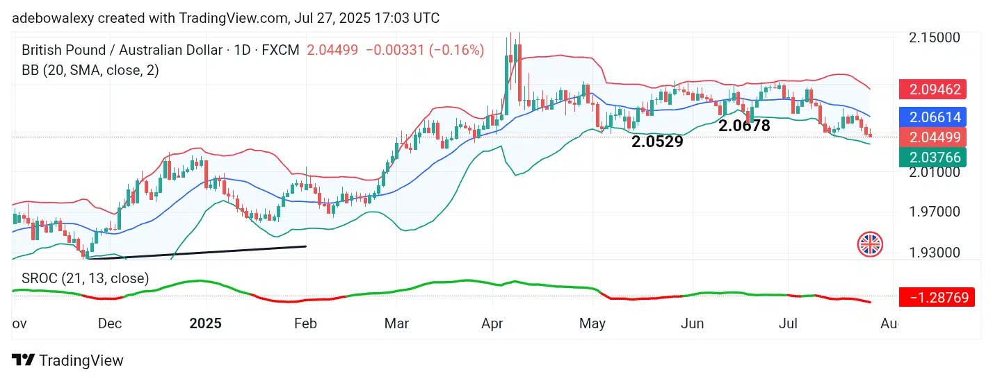 The GBPAUD market has pulled back below a significant technical level. Over the past three sessions, price action has declined beneath the midline of the Bollinger Bands (BB) indicator—an indication that bearish sentiment remains dominant. The BB indicator itself is now sloping downward, reinforcing the bearish bias.