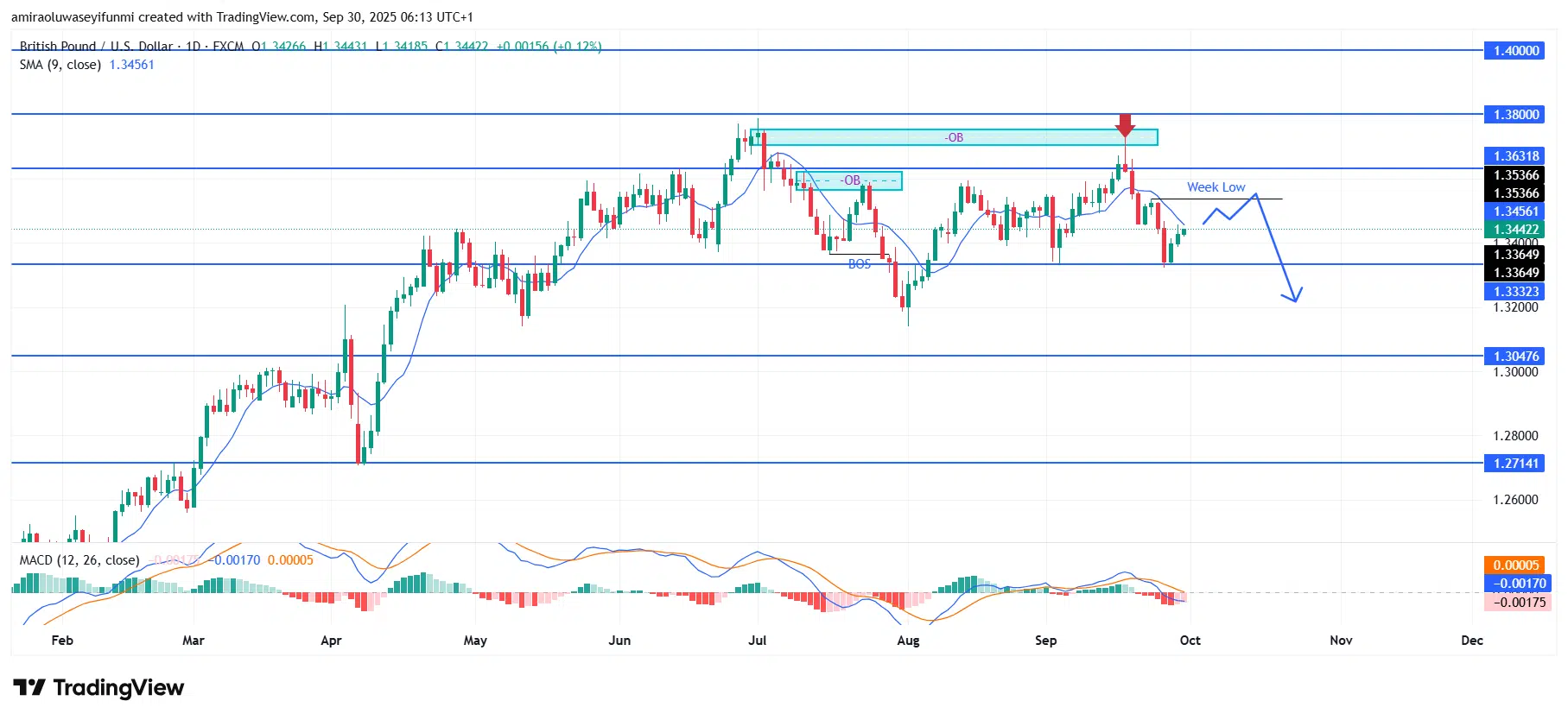 GBPUSD demonstrates an entrenched depreciation bias under persistent technical headwinds. The GBPUSD structure is showing reduced upward capacity, with recent movements reflecting a consistent contractionary tone across analytical indicators. The 9-day Simple Moving Average at $1.3460 now acts as a resistance ceiling, while the MACD oscillator maintains a negative gradient, confirming sustained weakening momentum. The combination of these technical factors reinforces the prevailing depreciation outlook.