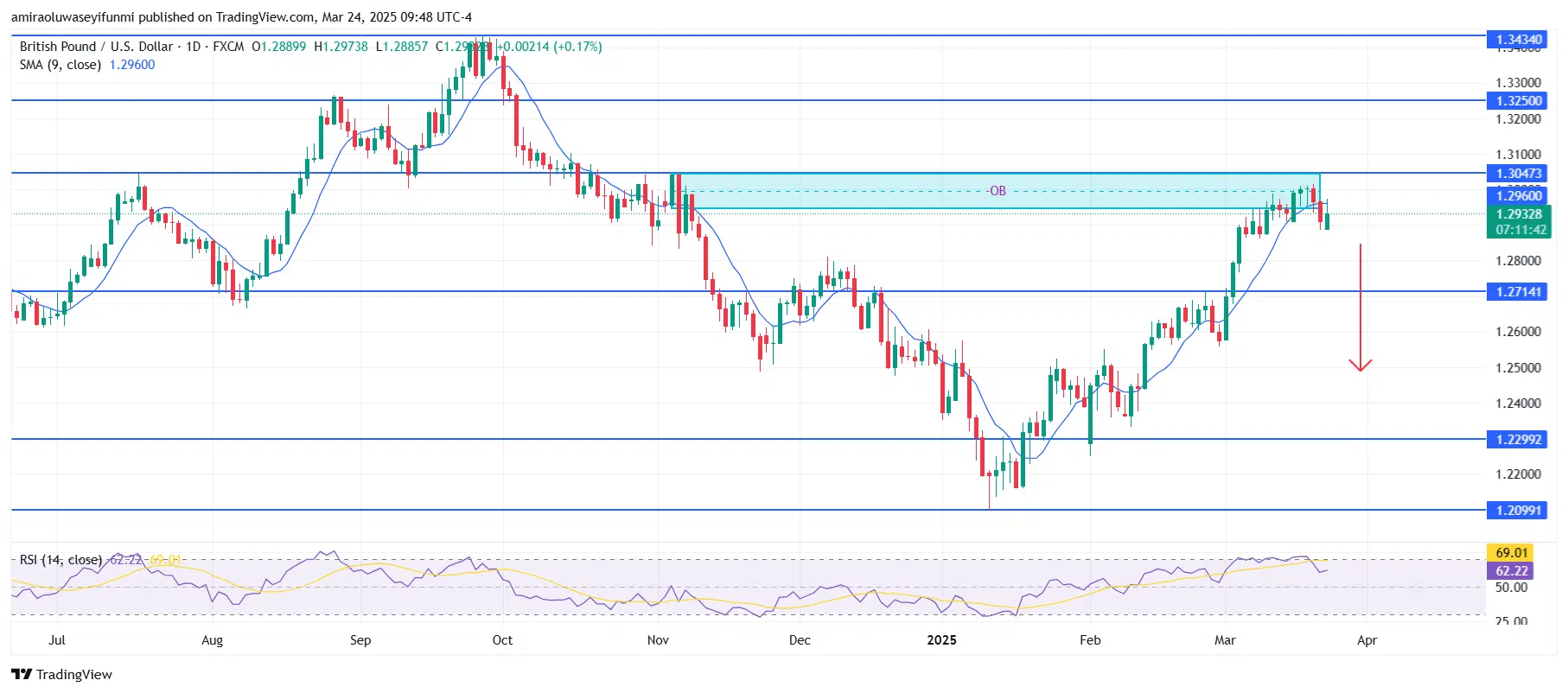 GBPUSD has faced rejection at a critical resistance zone, signaling a potential decline. The 9-day Simple Moving Average (SMA) is currently positioned at $1.29600, with the price now trading below it, suggesting the possibility of a bearish crossover. The Relative Strength Index (RSI) is at 62.27 and trending downward from an overbought level near 69.02, indicating that bullish momentum is waning. A continued drop in the RSI toward the 50.00 mark would confirm growing selling pressure and a potential shift in market sentiment.