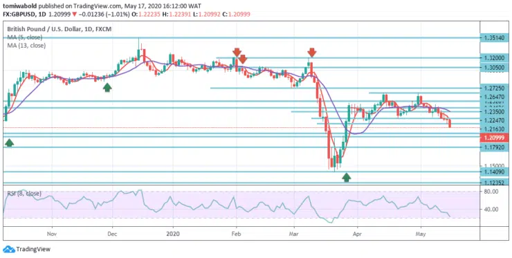 Markets predict that pound in the coming days may sink to 1.20 zone vs. USD, requiring steady slip beneath 1.2099 pivot level, which would also validate double-top at 1.2647 level.