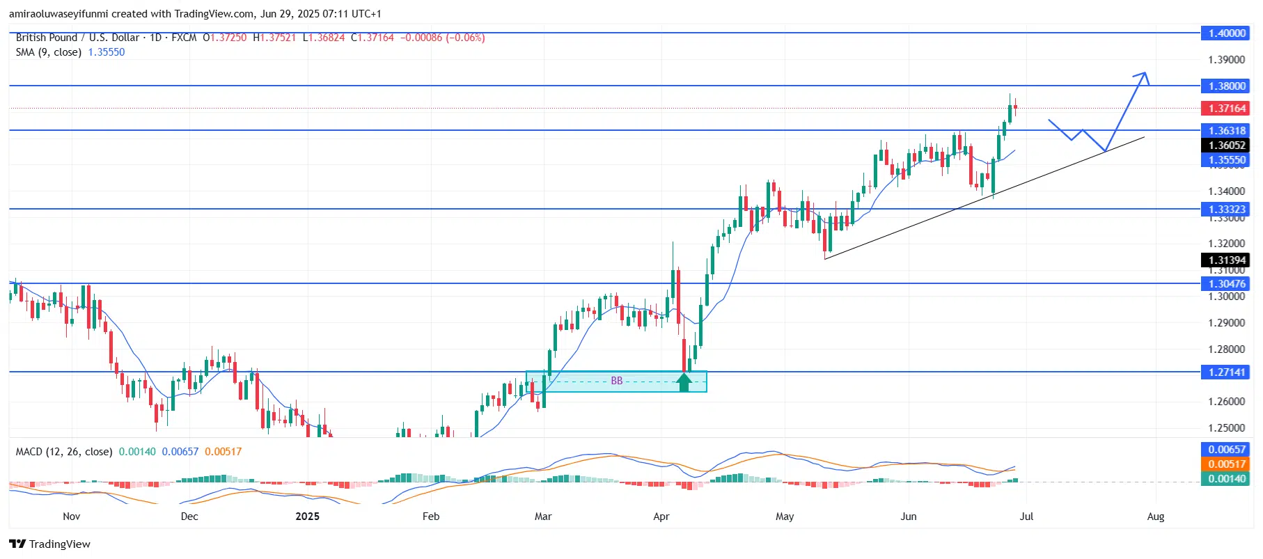The market recently rebounded from the ascending trendline support while staying above a key horizontal level at $1.36050. This confluence of the trendline and support zone has fueled the latest bullish surge. The price is now approaching minor resistance at $1.38000, where a brief consolidation or retracement might occur before further gains resume.