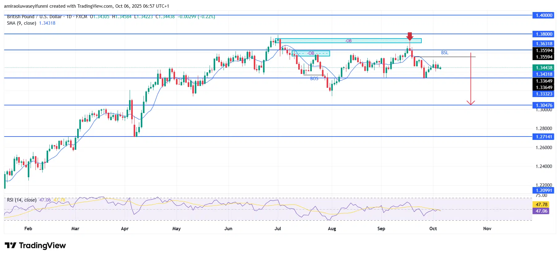 GBPUSD signals a continued downward movement as sellers reclaim short-term control. The pair is losing bullish momentum, with the 9-day SMA at $1.3430 currently exerting downward pressure on price action. Momentum indicators such as the RSI hover around 47, reflecting indecision but leaning toward bearish sentiment as the market struggles to sustain levels above the short-term moving average. This structure suggests that market participants are gradually transitioning from accumulation to distribution, consistent with broader bearish undertones.