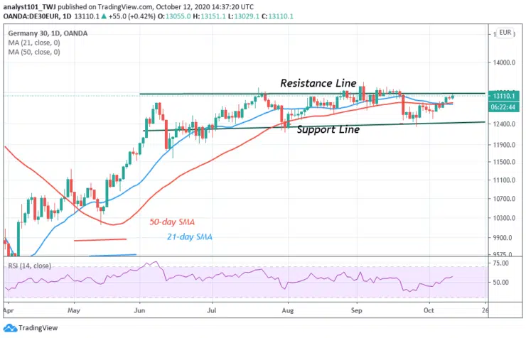 The index is range-bound between levels 12400 and 13400. Buyers face rejection at level 13450. The index has been fluctuating for over three months. The index has risen and it is approaching the resistance line to break above it.