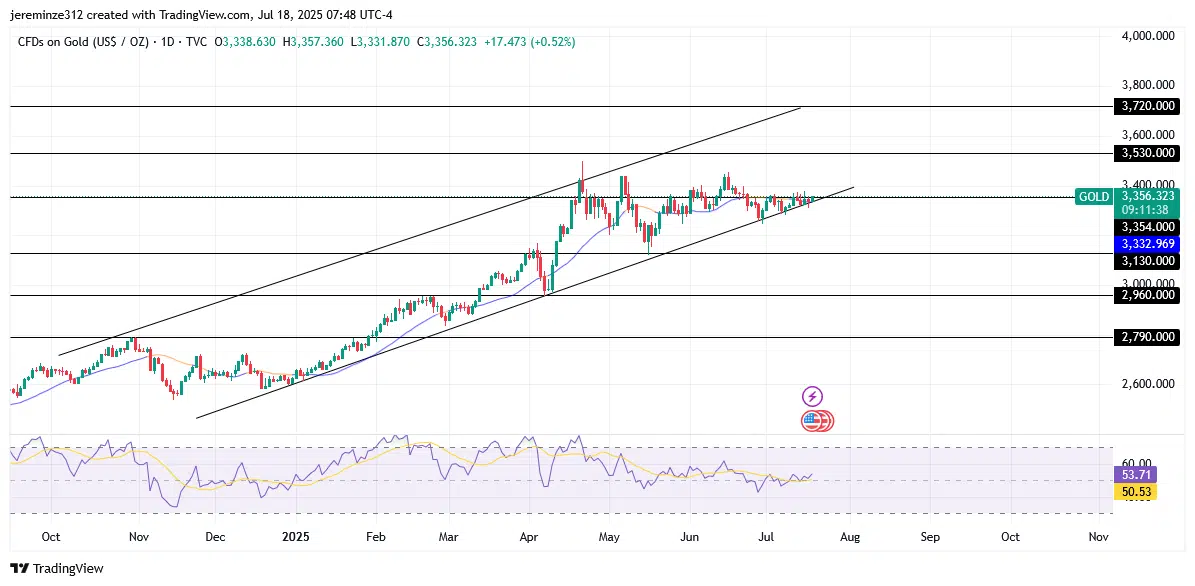 During this sustained uptrend, gold has gradually advanced without violating the trendline resistance. This steady climb is supported by the daily Relative Strength Index (RSI), which has remained in overbought territory for prolonged periods—an indication of persistent bullish momentum.