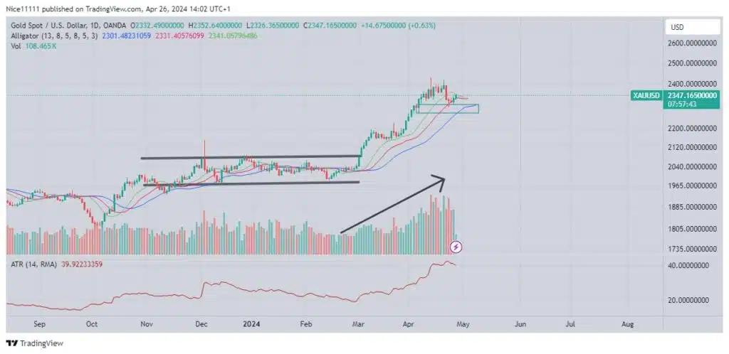 In the months of November to February, the volume bars exhibited consistent sizes, reflecting a lack of significant directional bias. Additionally, the Williams Alligator indicator predominantly hovered within the range formed by the daily candles, further indicating a lack of clear market direction. However, March brought about a substantial change as the market witnessed a notable uptick in volatility, culminating in a breakout.