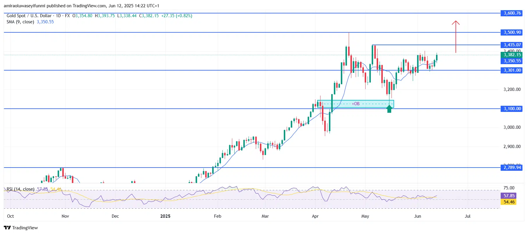 Gold (XAUUSD) gains momentum on a strong bullish structure and solid support. The XAUUSD pair continues to exhibit a clear upward trajectory, consistently trading above the 9-day Simple Moving Average (SMA), which is currently positioned around $3,350. This alignment indicates sustained buying interest, supported by the Relative Strength Index (RSI) reading of 57.93. The RSI confirms bullish momentum while staying below overbought levels. Price action has remained firm above key moving averages, pointing to institutional participation and reinforcing the likelihood of trend continuation.