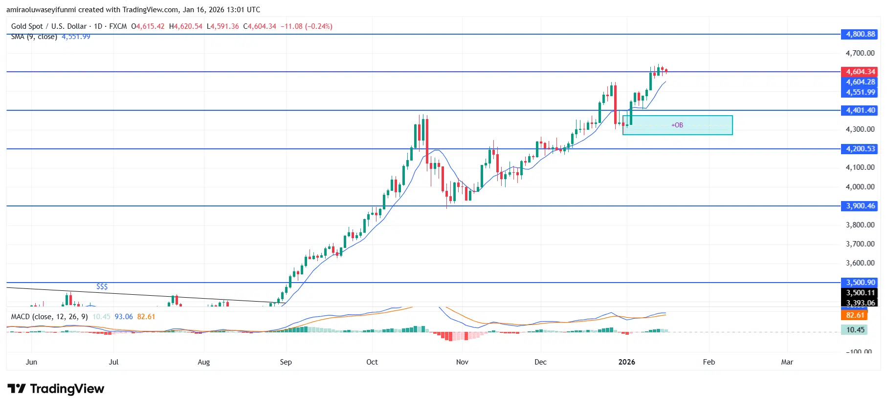 Gold (XAUUSD) on the four-hour chart is showing signs of a short-term corrective pullback following an extended bullish run. Price is stalling near recent highs, with rejection wicks forming while trading slightly below the 9-period moving average, indicating weakening upside momentum. The MACD histogram is flattening as signal lines converge, pointing to a slowdown in bullish pressure and an increased risk of retracement. A corrective move toward the highlighted demand and order block zone below would align with healthy market structure and prevailing forex signals before any potential trend continuation.