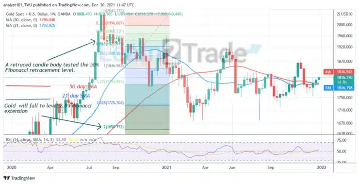 Gold’s (XAUUSD) price is in an uptrend as it faces rejection at an overbought region. The uptrend has reached the overbought region of the market. The market has risen to l$1,817. If it faces rejection; the market will decline to the low of $1,799.