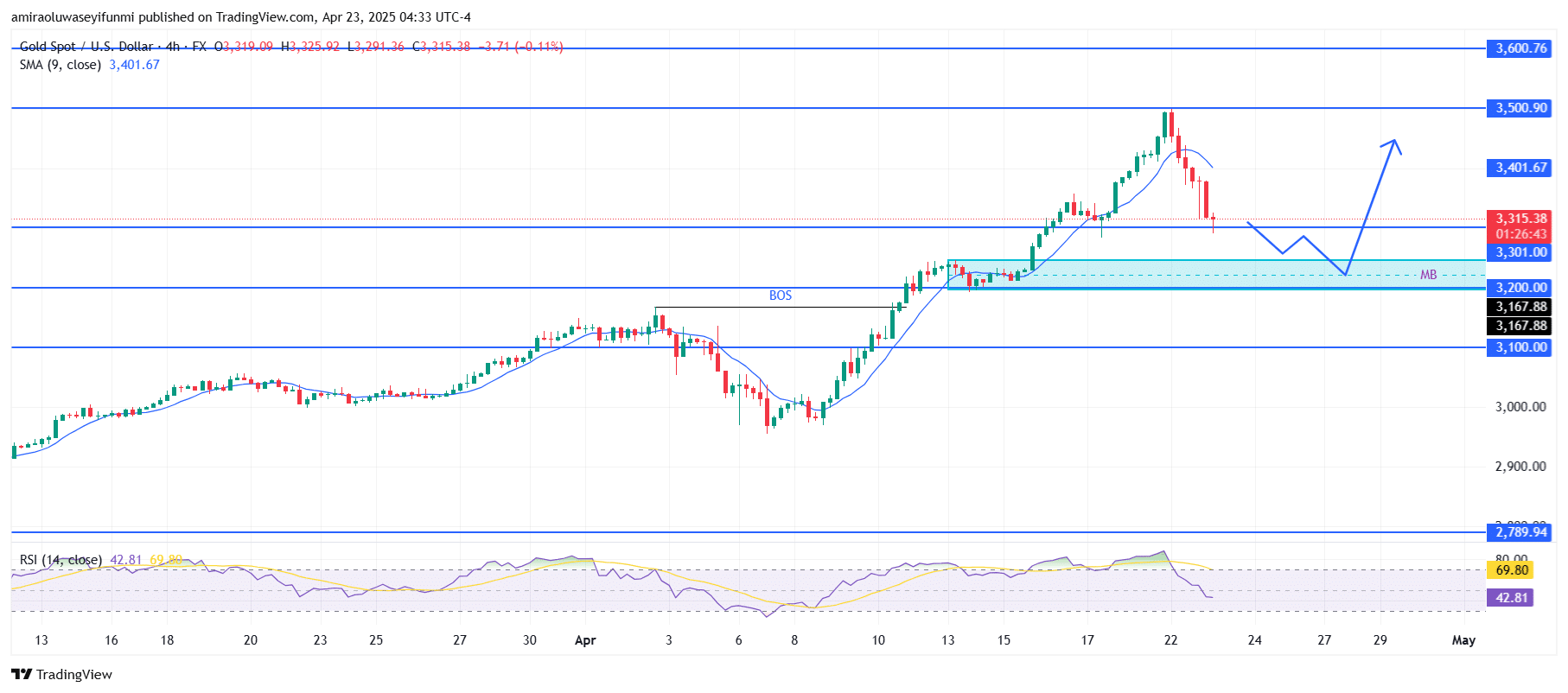 XAUUSD maintains its bullish stance on the four-hour chart, despite the ongoing pullback. The price is nearing a significant demand zone around $3,200, which aligns with a previous breakout structure. Traders using forex signals may find this area critical, as the RSI has decreased to 42.90, suggesting the market is cooling off and potentially setting up for a bullish reversal. A bounce from this demand zone could propel prices back toward the $3,400 and $3,500 resistance levels.