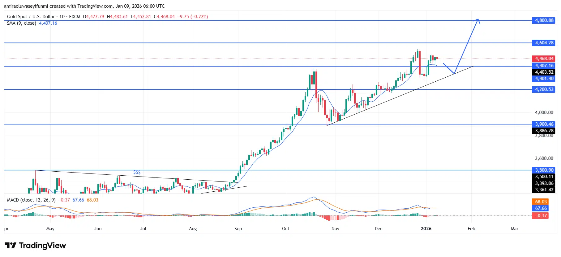 Gold (XAUUSD) remains structurally bullish on the four-hour chart, with price trading above the rising trendline and key support near $4,400. However, short-term momentum is cooling, as price stalls below $4,480 and indicators point to a brief corrective phase. A measured pullback toward the $4,360–$4,380 zone is likely to attract fresh demand rather than undermine the prevailing trend. As long as $4,300 holds, the broader bullish trajectory toward $4,600 remains intact.