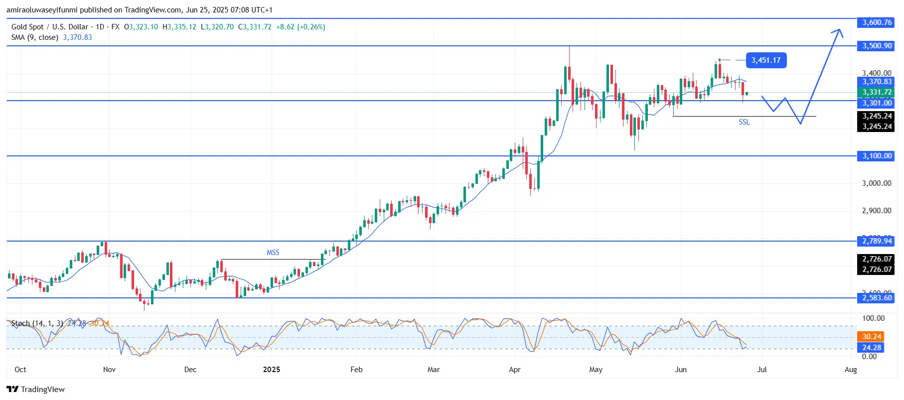 On the four-hour chart, bearish pressure is starting to fade as XAUUSD finds support around the $3,300 level. The Stochastic Oscillator is beginning to curve upward from oversold conditions, highlighting reduced selling momentum and the possibility of renewed bullish activity. Should bulls manage to reclaim the $3,360–$3,450 zone, the price could gain traction toward the $3,500 resistance level.