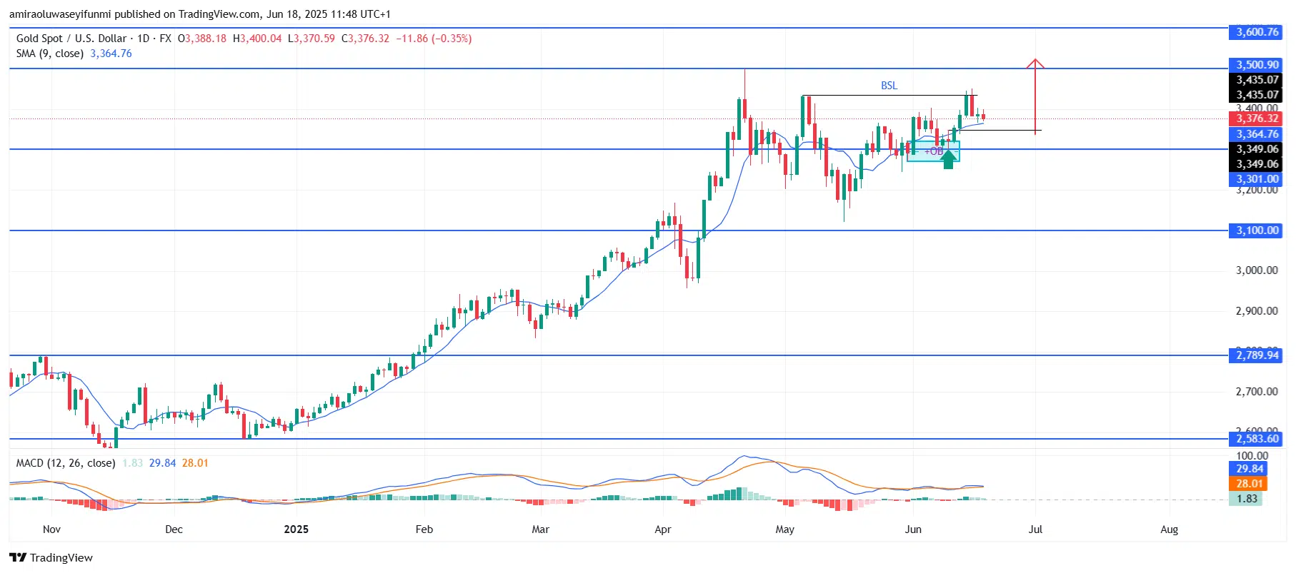 Gold (XAUUSD) continues to maintain bullish momentum, supported by strong technical fundamentals. The overall directional bias remains firmly bullish, as evidenced by its consistent climb above the 9-day Simple Moving Average (SMA), which is currently trading near $3,370. Momentum indicators further support this outlook, with the Moving Average Convergence Divergence (MACD) histogram showing a slight bullish crossover as the MACD line attempts to rise above the signal line. Despite minor pullbacks, price action has followed a pattern of higher lows and steady recoveries, reflecting strong demand in the gold market. The recent pullback from the $3,400 region appears to be a corrective move rather than a reversal, aligning with a healthy bullish market structure.