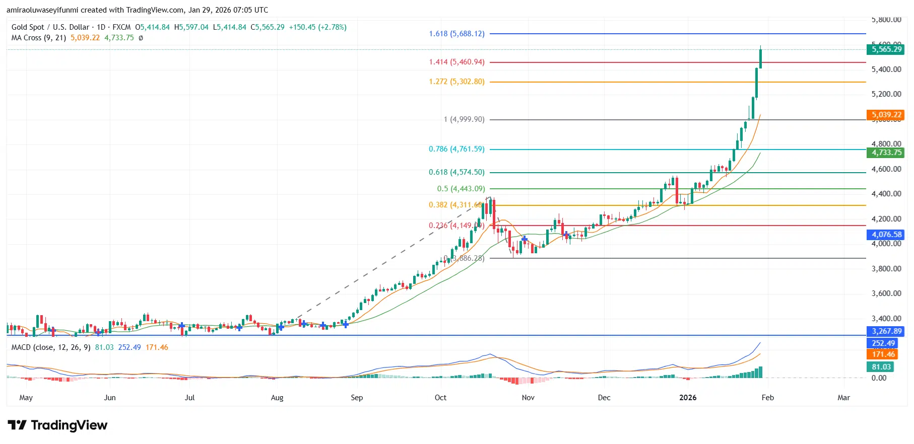 Looking ahead, XAUUSD appears positioned to test the $5,680 region initially, with scope for extension toward $5,800 should buying momentum remain intact. Any near-term retracements are likely to encounter demand near $5,000 or $4,760, potentially offering renewed accumulation opportunities. The broader technical picture remains constructive, favoring further appreciation as long as the bullish framework holds.