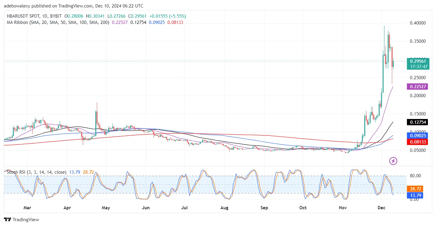 The general crypto market took a shock when Bitcoin dipped below the $95,000 threshold in the last 24 hours. This affected most major cryptocurrencies, including the HBAR token, which crashed below the $0.3000 threshold. However, today’s trading activity has printed a recovery of 11.41%. Let’s take a closer look at the market below in more detail.