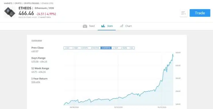 - eToro quotes the pair at $465.50 – meaning for every Ethereum coin you will get 465.50 EOS