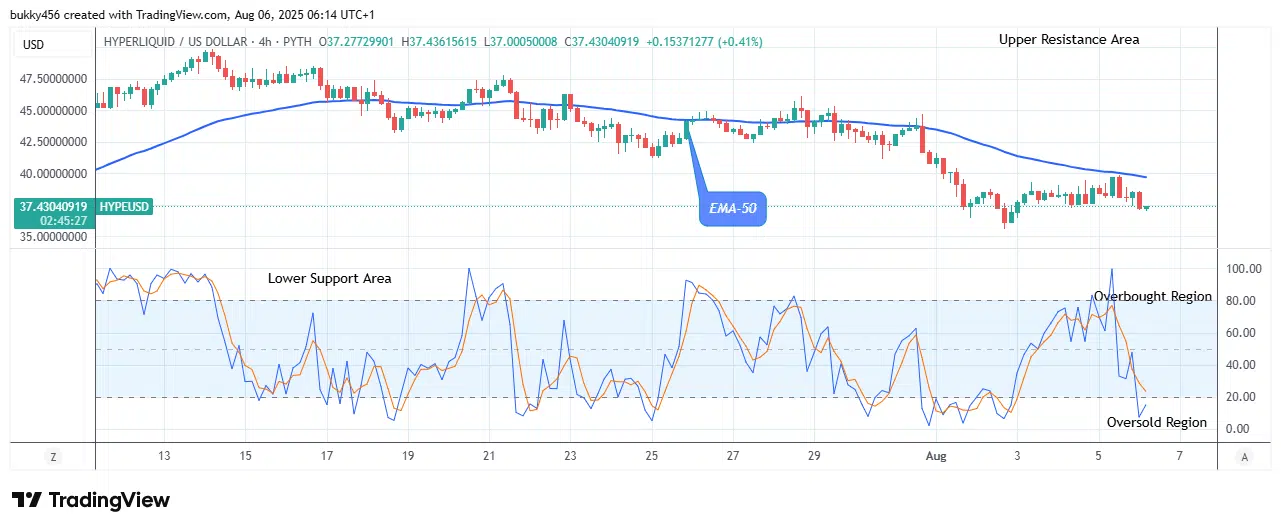 The Hyperliquid pair is attempting an upward rally and may see more growth as it resumes its bullish trend. It targets the resistance level on its higher time frame. The price is below the EMA-50, which shows a bearish market zone.
