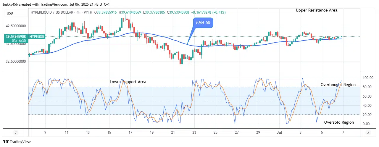 The Hyperliquid price breakout at the $39.61 resistance value above the EMA-50, as the 4-hourly chart opens today, indicates a high buying impact from the bulls, resulting in intraday gains.