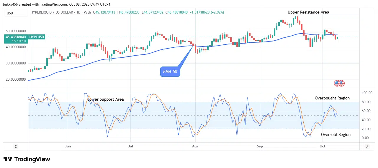The Hyperliquid price is attempting the next upward rally as it resumes its bullish rally, targeting the resistance level in its higher time frame. Further, the price is below the EMA-50, indicating a bearish market zone.