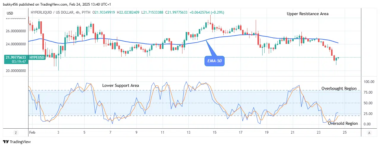 Therefore, if the crypto makes an intense rally from its present price at the $22.02 high value above the moving average line, the HYPEUSD will rise from support and enter a bullish trend. However, the buy traders may see immediate gains if this push continues to the $25.87 resistance area.
